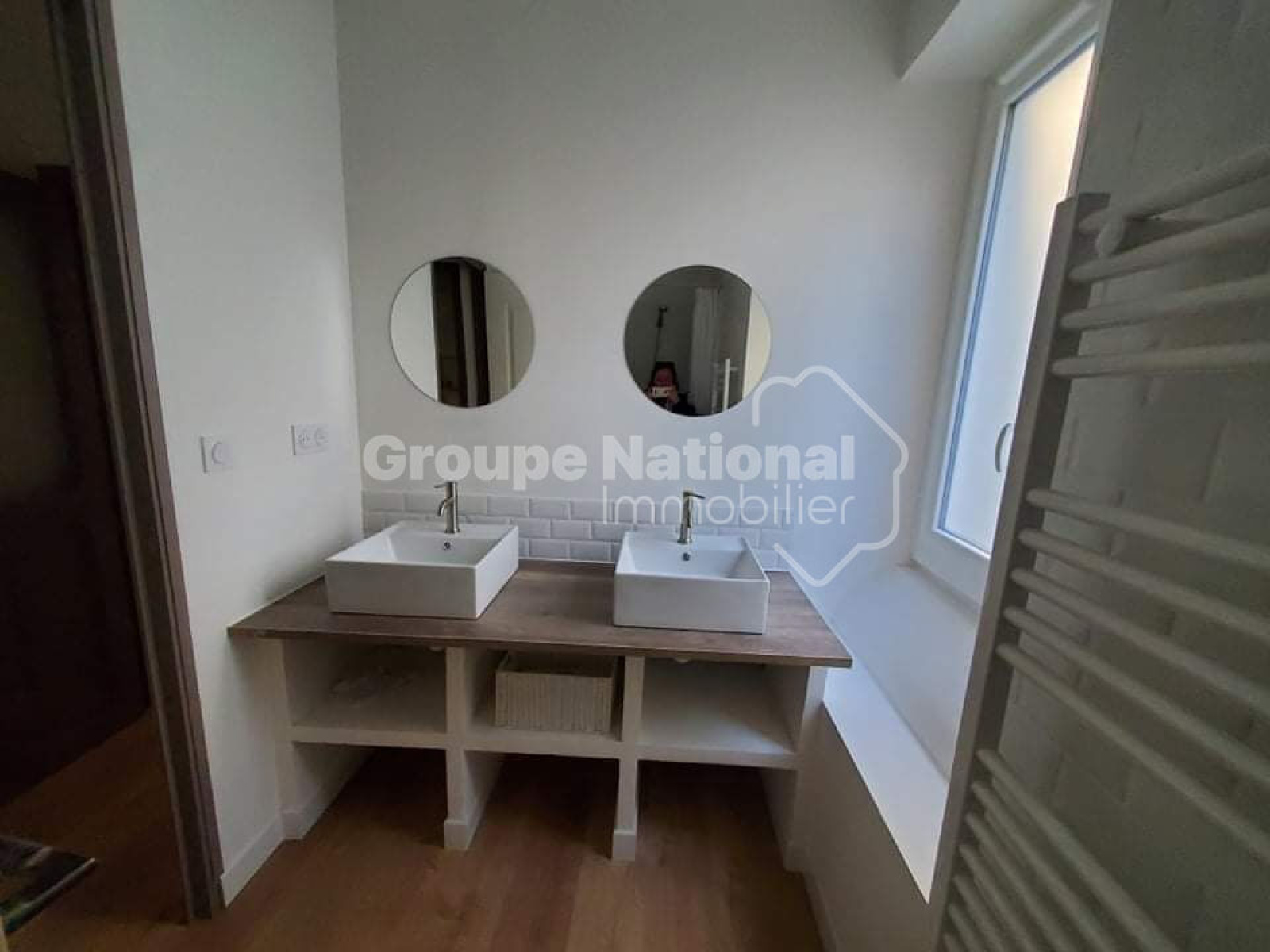 Une salle d'eau moderne avec double vasque, ainsi que des rangements. et deux grandes chambres avec rangements.