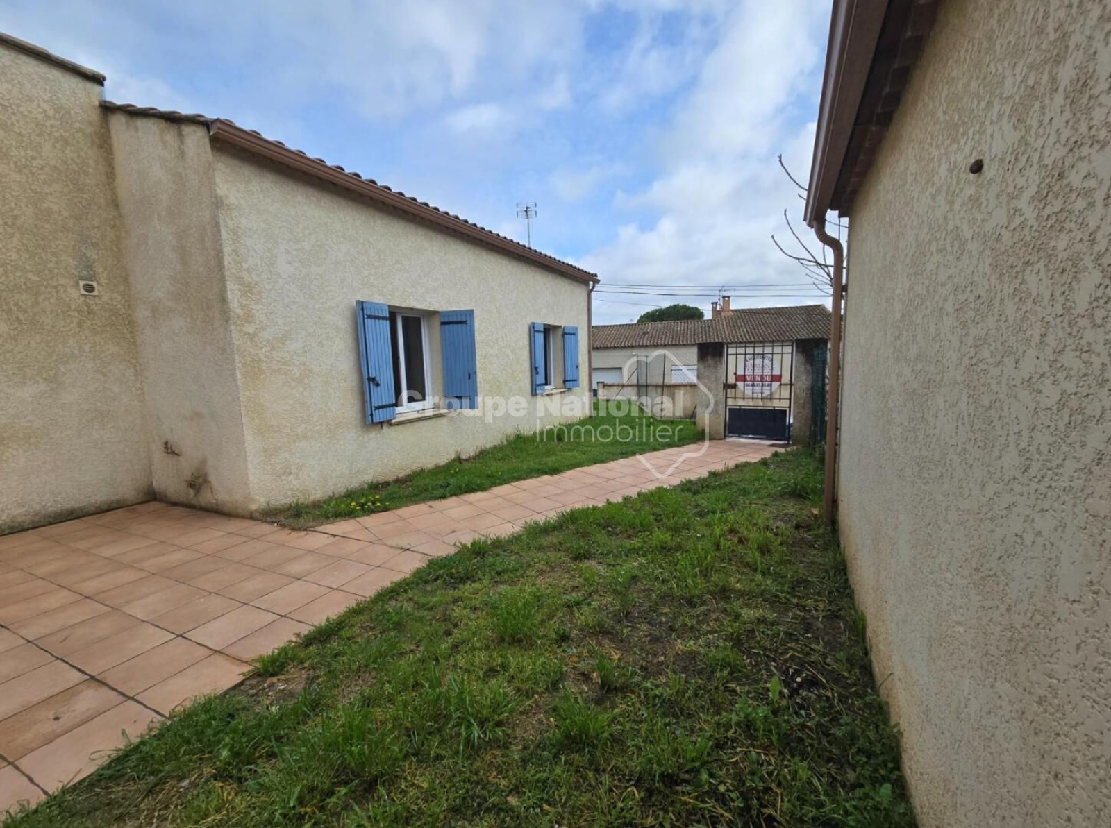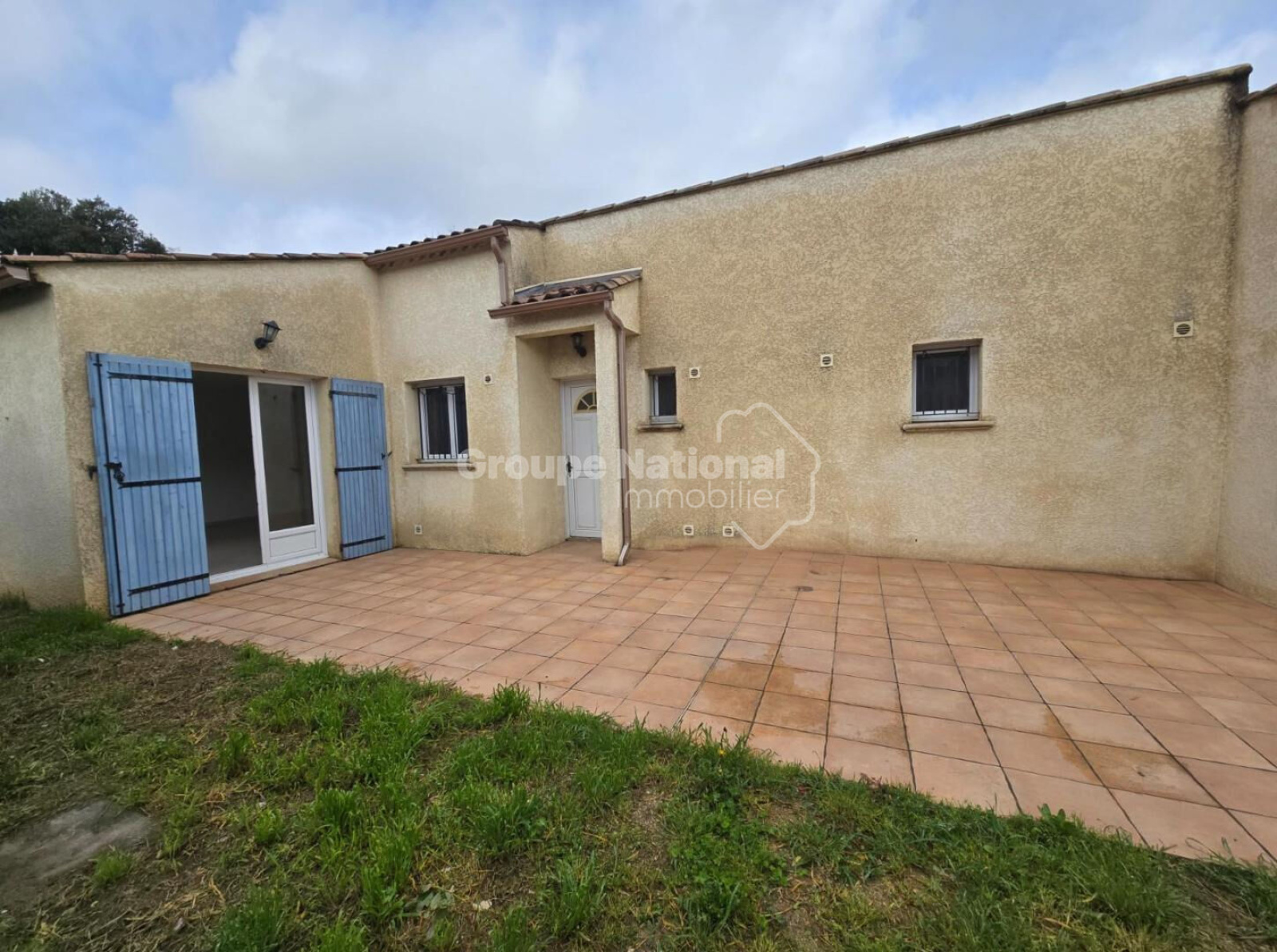 une belle terrasse carrelée et un espace gazonné.